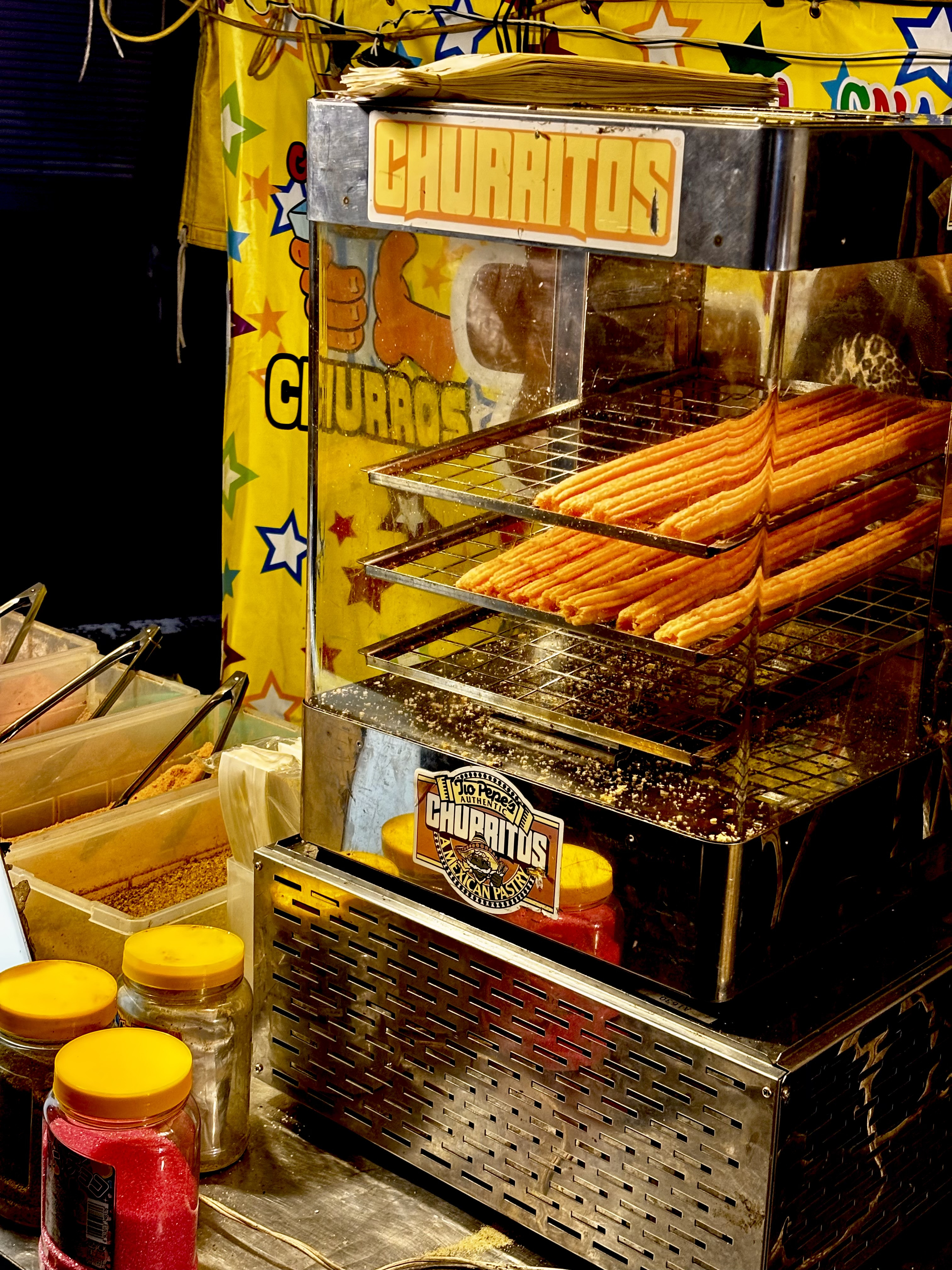 リンゴ飴、肉串焼、広島焼き、チュロス